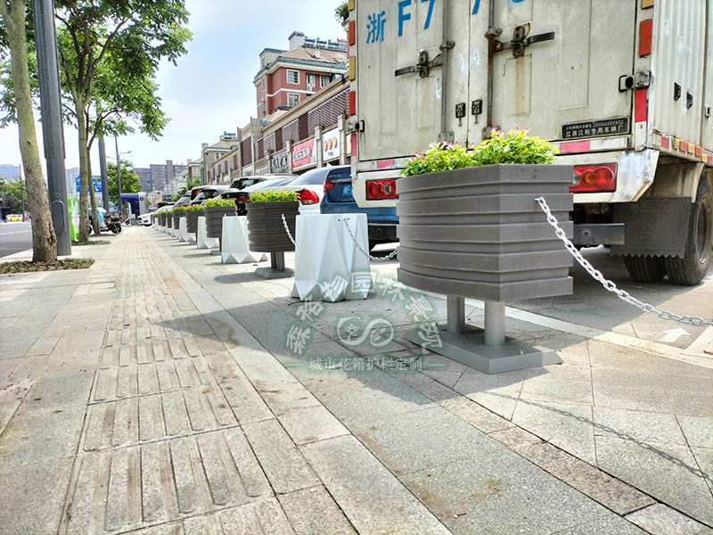 在道路隔離上,一桶一鏈花箱多采用一個花箱加一個鏈條的鏈接方式,而在人行道或者是街道公園的隔離方式上,則更為多樣,可以是三個為一組,也可以是間隔一段放兩個。